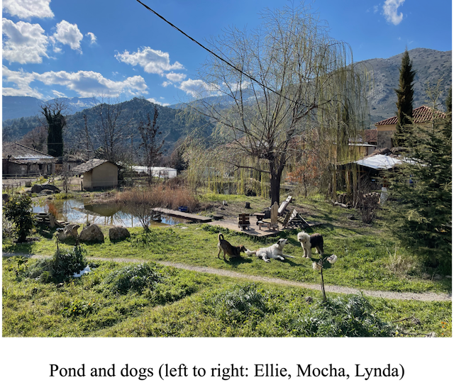 If you could somehow manage to tear your eyes away from them you will see Maya, the sanctuary’s resident donkey (2). Behind her house is the koi pond (3). During our first few days here, when the weather was on the sunnier side, this was a common place for people to hang around, with a book, some music or even a pillow. This same pond, was where Jack and Kyle (a Re-Green volunteer) went swimming in the freezing cold water. They had quite the crowd, but none as brave and willing to take the plunge. Past that is the house of our elderly neighbor who we delivered firewood to (4). Her house is affectionally called the “Cat Farm” as she is known in the feline community for having cat food out all the time.