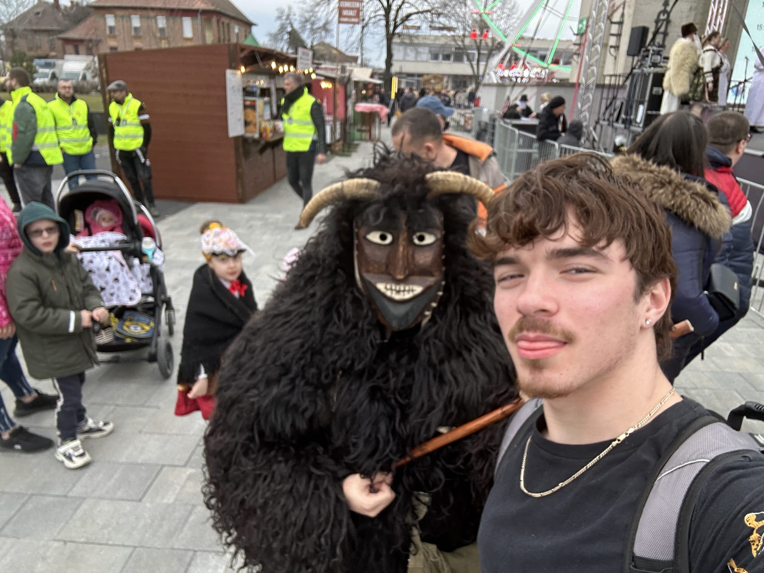My second would definitely be all of the experiences I’ve had on my days off, seeing much of what southwestern Hungary has to offer. Specifically, the Busójárás festival of Mohács, commemorating the end of winter, is one of the three specific Hungarian traditions on UNESCO’s Representative List of the Intangible Cultural Heritage of Humanity. It’s an incredible festival, filled with countless food, clothing, and trinket stands, tons of folk music and dancing, and a massive fire on the last day (we weren’t there for it ). The main attraction, however, is the people dressed up in sheepskins, wearing carved wooden devil masks, who go around causing mischief and making noise.