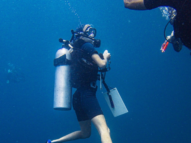 Luckily, while some interns are completing their PhD and are really insightful about marine biology, others (like me) are here to try something completely out of their comfort zones. I spent my first month going to intensive lectures in the morning and applying that knowledge to our dives in the afternoon. We commonly debrief after the dive and check each other’s data. I’ve learned that conservation diving is almost a complete 180 from “fun diving.” On an everyday dive, I carry a reel to measure the distance, a ruler, my slate to write the data, a dive computer, a compass, and a visibility disk. On a fun dive I jump in the water with me, myself, and I.